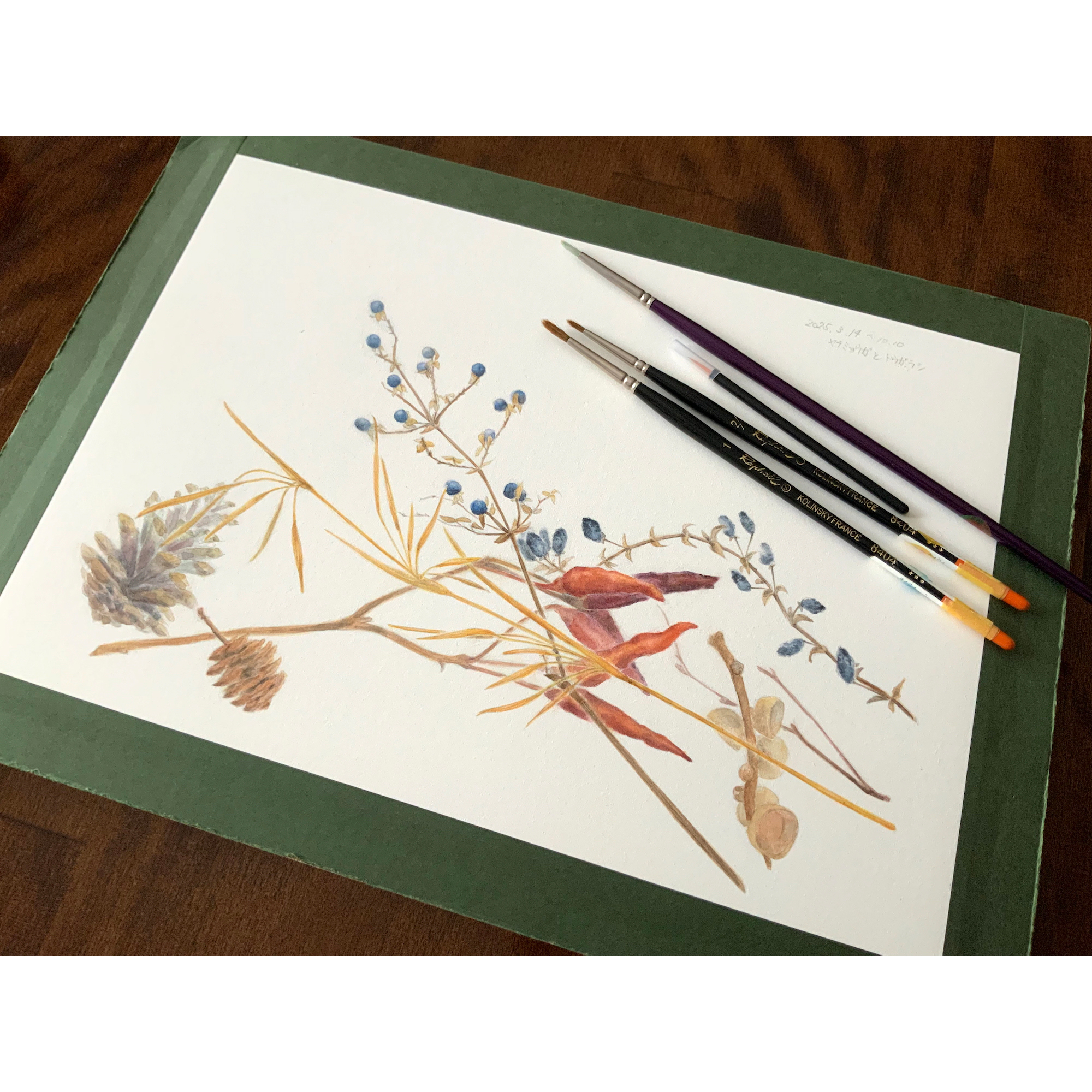 植物画が完成しました。半年以上のんびり描いておりました、あはははは。今回は初めて「異種組み合わせ」をしました。情報量の多さに「ひょえー!どこから描いたらいいの?」と頭真っ白。マツボックリなんかは気力が果てて描きが薄いですね(笑)。