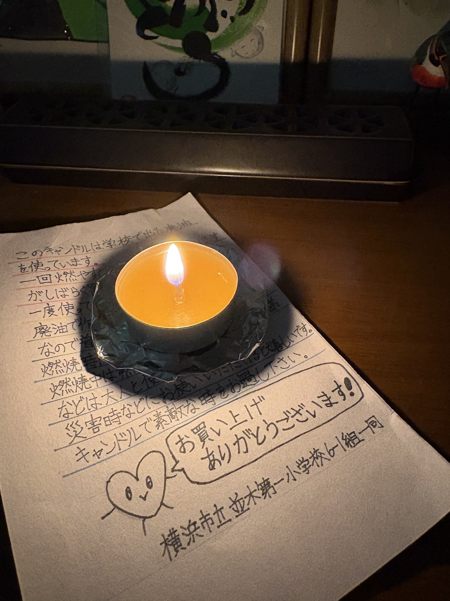廃油でキャンドル zizodo | 2025年12月24日 | 日常つれづれ | コメントはまだありません お友達からいただいたキャンドルは並木第一小学校の6年1組の生徒さんが作ってくれた素敵なものです。学校の廃油から作られていて、とても温かみのある炎です。ほんのり油の匂いもあり子供たちの生活が味わえます(^^) 暖かいなぁ Related Posts 微妙にハズレ感が コメントはまだありません | 12月 29, 2015 積む積む石板 コメントはまだありません | 12月 21, 2017 応援Stamp”走る透明感” コメントはまだありません | 10月 11, 2019 シーサイドラインフェスタ2024 コメントはまだありません | 4月 25, 2024 About The Author 似顔絵せいこ 横浜市金沢区の似顔絵師爆誕!を目指して一日一歩で進みます。日常のアレコレ、似顔絵のアレコレを思うままに載せてます。 Add a Comment コメントをキャンセルメールアドレスが公開されることはありません。 ※ が付いている欄は必須項目ですComment:*Name:* Email Address:* Website: Save my name, email, and website in this browser for the next time I comment. reCaptcha の認証期間が終了しました。ページを再読み込みしてください。 Δ