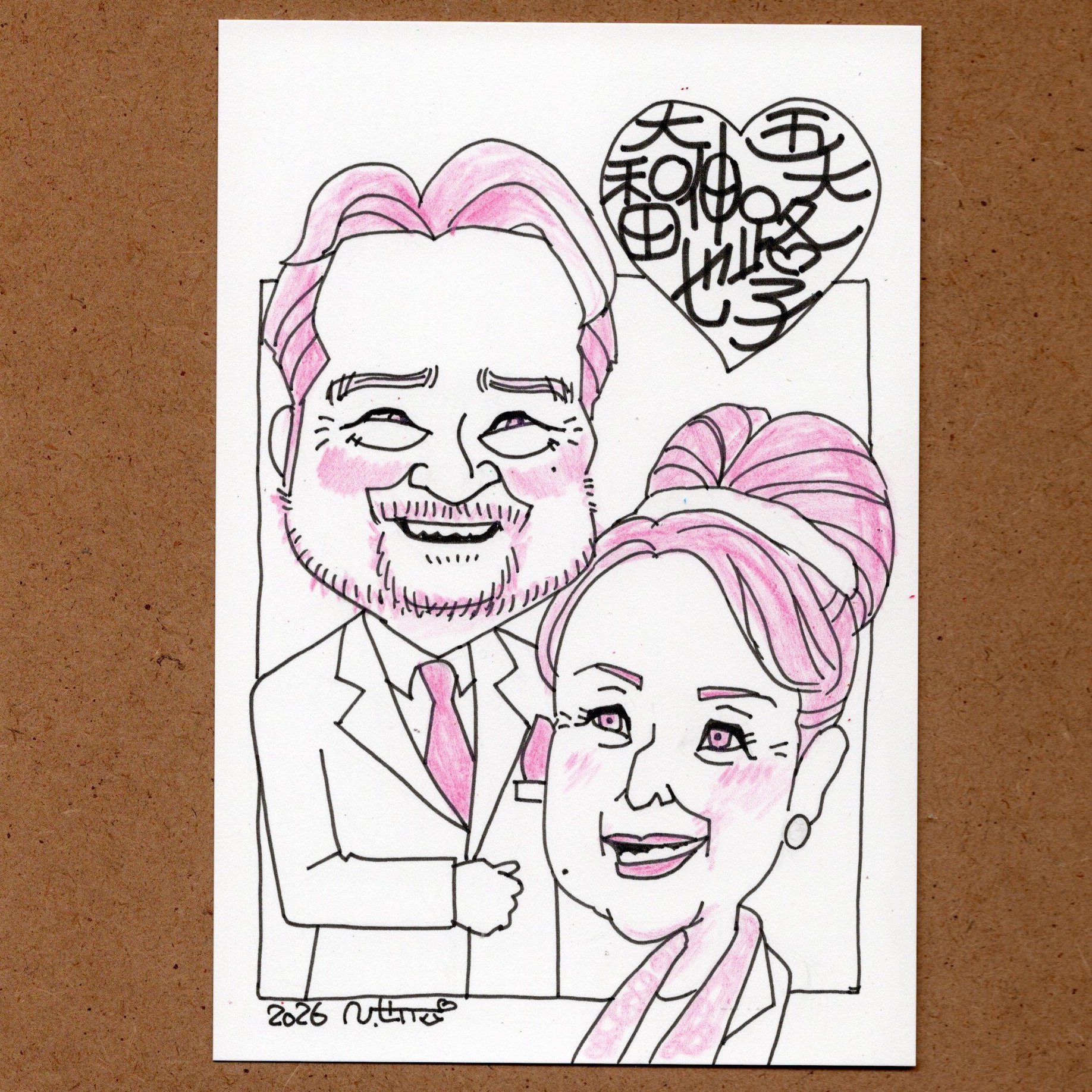五大路子さん似顔絵 zizodo | 2026年2月27日 | 似顔絵 | コメントはまだありません <ワンカラーサンプル>横浜出身より「五大路子さんと大和田伸也さん」。五代さんが横浜出身です。ラブラブですね〜。絵柄は色紙バージョンにしました。描けてよかった〜。使用:プロッキー、クーピーペンシル、ハガキサイズ 仲いいですね Related Posts 似顔絵修行0702 コメントはまだありません | 7月 2, 2021 似顔絵修行1107 コメントはまだありません | 11月 7, 2019 煙山光紀さん似顔絵 コメントはまだありません | 9月 20, 2023 安住紳一郎さん似顔絵 コメントはまだありません | 9月 12, 2024 About The Author 似顔絵せいこ 横浜市金沢区の似顔絵師爆誕!を目指して一日一歩で進みます。日常のアレコレ、似顔絵のアレコレを思うままに載せてます。 Add a Comment コメントをキャンセルメールアドレスが公開されることはありません。 ※ が付いている欄は必須項目ですComment:*Name:* Email Address:* Website: Save my name, email, and website in this browser for the next time I comment. reCaptcha の認証期間が終了しました。ページを再読み込みしてください。 Δ