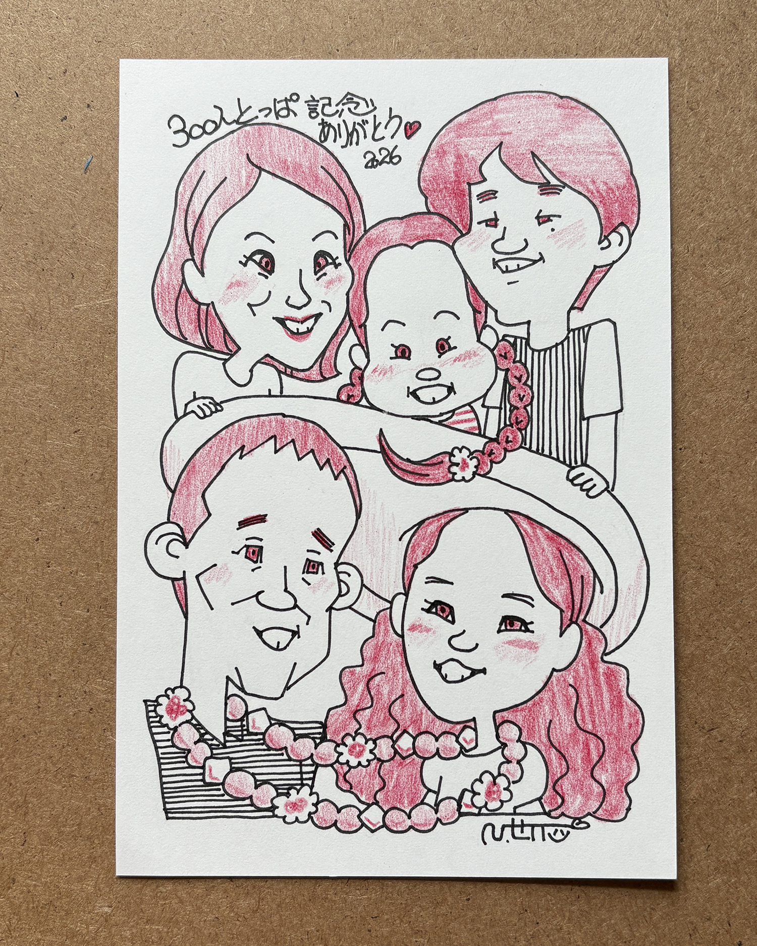 ハガキサイズの記念作品 zizodo | 2026年3月11日 | 似顔絵 | コメントはまだありません <記念作品>フォロワー300人突破記念の似顔絵ご家族5名様をハガキに詰め込んで幸せいっぱいの風景です描いている私も自然と笑顔になっちゃった額に入れてお渡しいたしました〜応募ありがとうございます ご家族5名様 Related Posts 地域の落語会2019 コメントはまだありません | 6月 30, 2019 いつ最終回に? コメントはまだありません | 5月 3, 2024 似顔絵カレンダー2026 コメントはまだありません | 11月 23, 2025 1011の似顔絵下書き コメントはまだありません | 10月 8, 2019 About The Author 似顔絵せいこ 横浜市金沢区の似顔絵師爆誕!を目指して一日一歩で進みます。日常のアレコレ、似顔絵のアレコレを思うままに載せてます。 Add a Comment コメントをキャンセルメールアドレスが公開されることはありません。 ※ が付いている欄は必須項目ですComment:*Name:* Email Address:* Website: Save my name, email, and website in this browser for the next time I comment. reCaptcha の認証期間が終了しました。ページを再読み込みしてください。 Δ