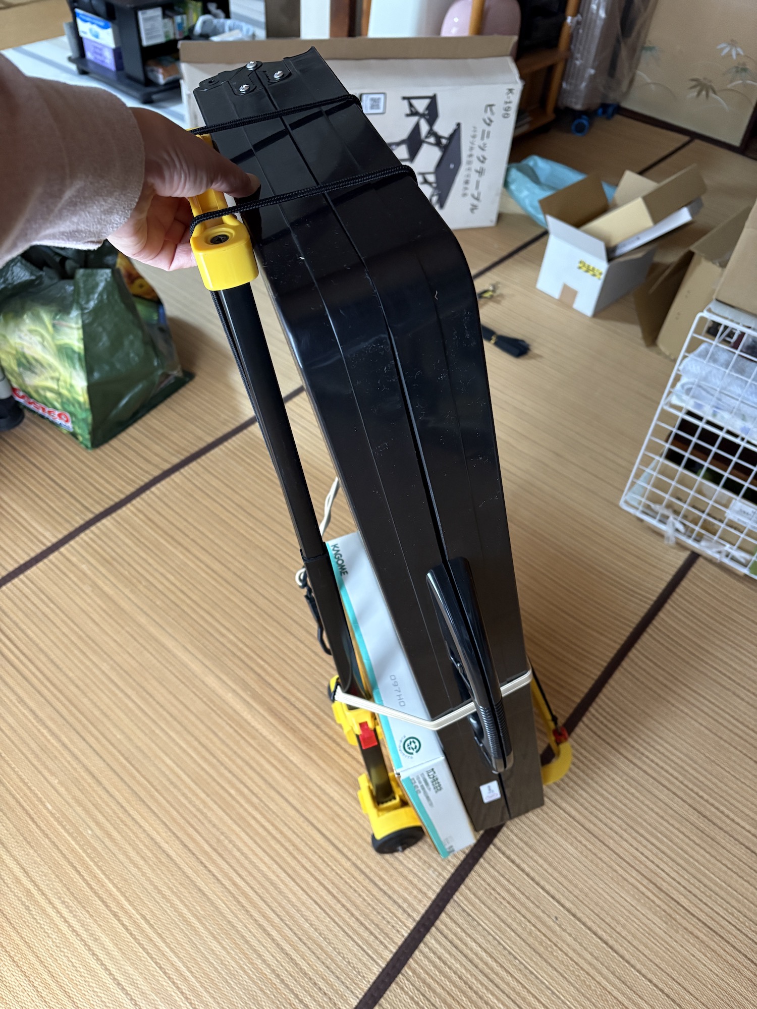折りたたみテーブルと椅子セットを一人で運べるようにキャリーに乗せてシミュレーションにもトライ!1階〜4階までの階段は別々に運ぶとしても、現地まではコレと大型リュックで画材を運べそうです。席書、40歳で始めてれば肩や足腰を痛めなかったかも〜・・と後悔先に立たず(笑)。これからできることを頑張りましょう!!まだまだ遅くないもんネ